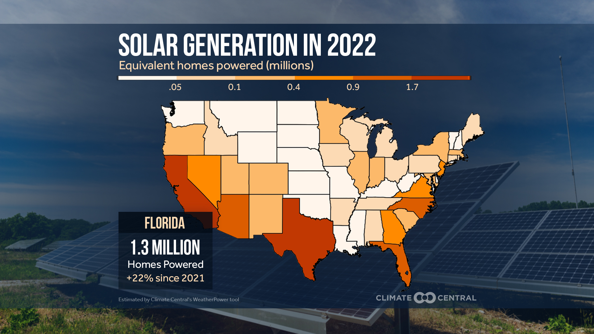 The numbers are in for alternative - solar & wind - energy use in 2022. Florida’s homes powered by solar energy increased 22% within one year. Images & info. below from “Climate Matters”: