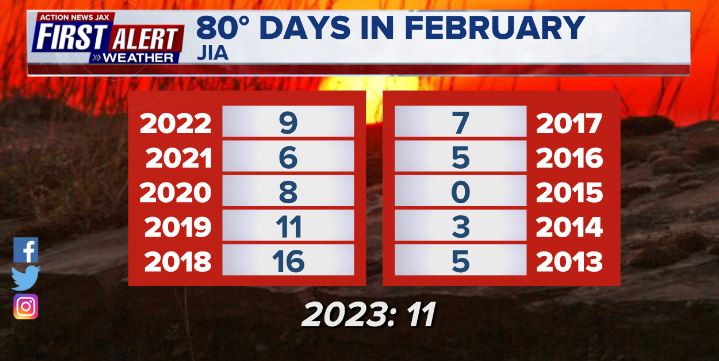 Jacksonville, FL — Spring has sprung in February across NE Fl./SE Ga.! The avg. temp. through Feb. 22 stood at 63.5 degrees making it the 12th warmest so far but going up the “ladder” quickly. Based on the First Alert Forecast, the month will likely end up very near - if not the - warmest on record for Jacksonville. Unfortunately the warm stretch of temps. (avg. is 69-70 degrees) is helping oak pollen to “take off”. Jax will also be very near the most 80-degree days ever recorded in February at 16 days. Warmest avg. Feb. temps. for Jacksonville going back to 1871:
