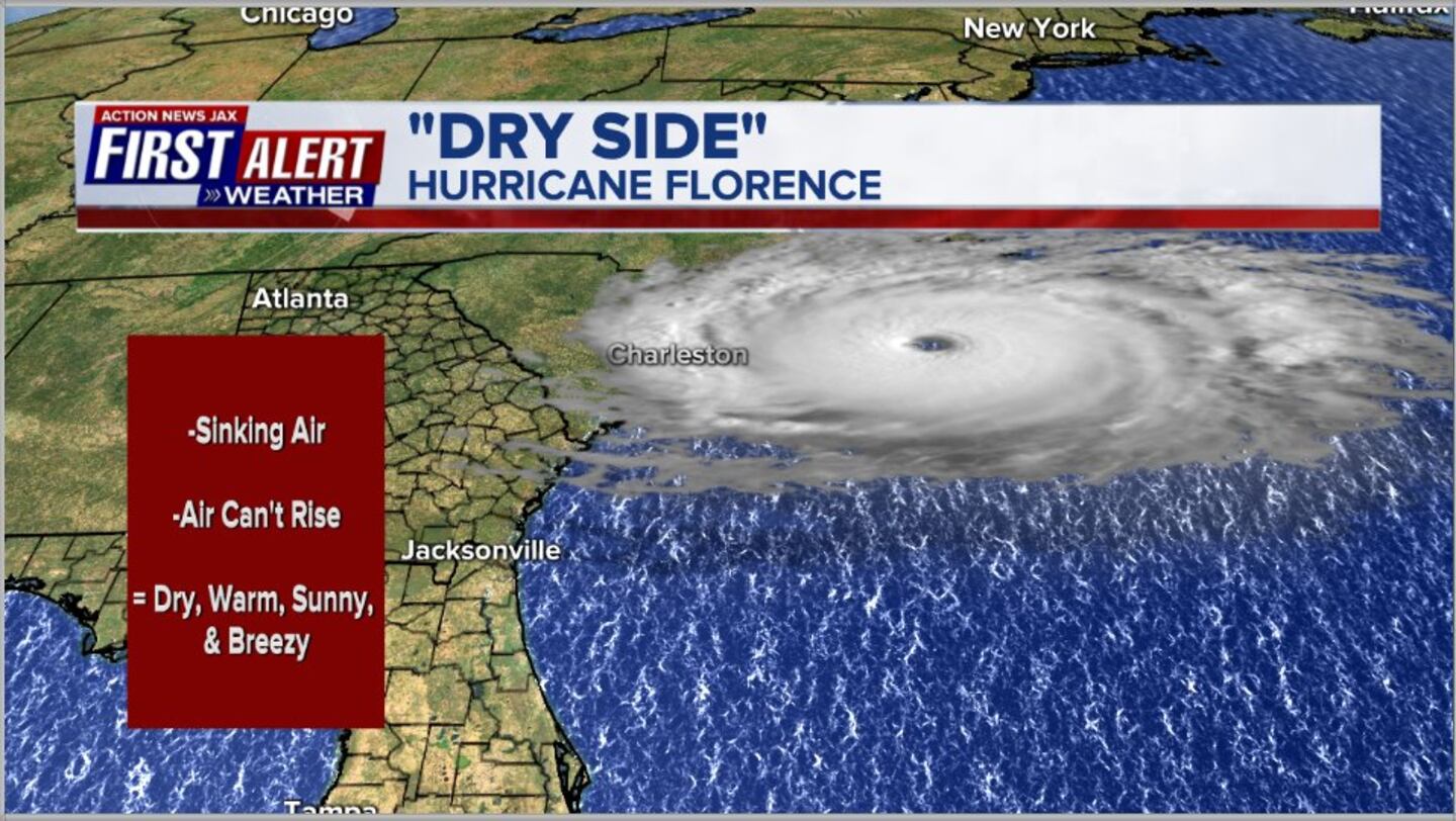 Lucky for Jacksonville/NE Fl./SE Ga.... we were on the subsident or dry side of Florence. The atmosphere has to compensate for the massive updrafts in & near a hurricane, so that balance is massive sinking (descending) air on the far fringe of a hurricane. The result is sunny, breezy, dry weather.