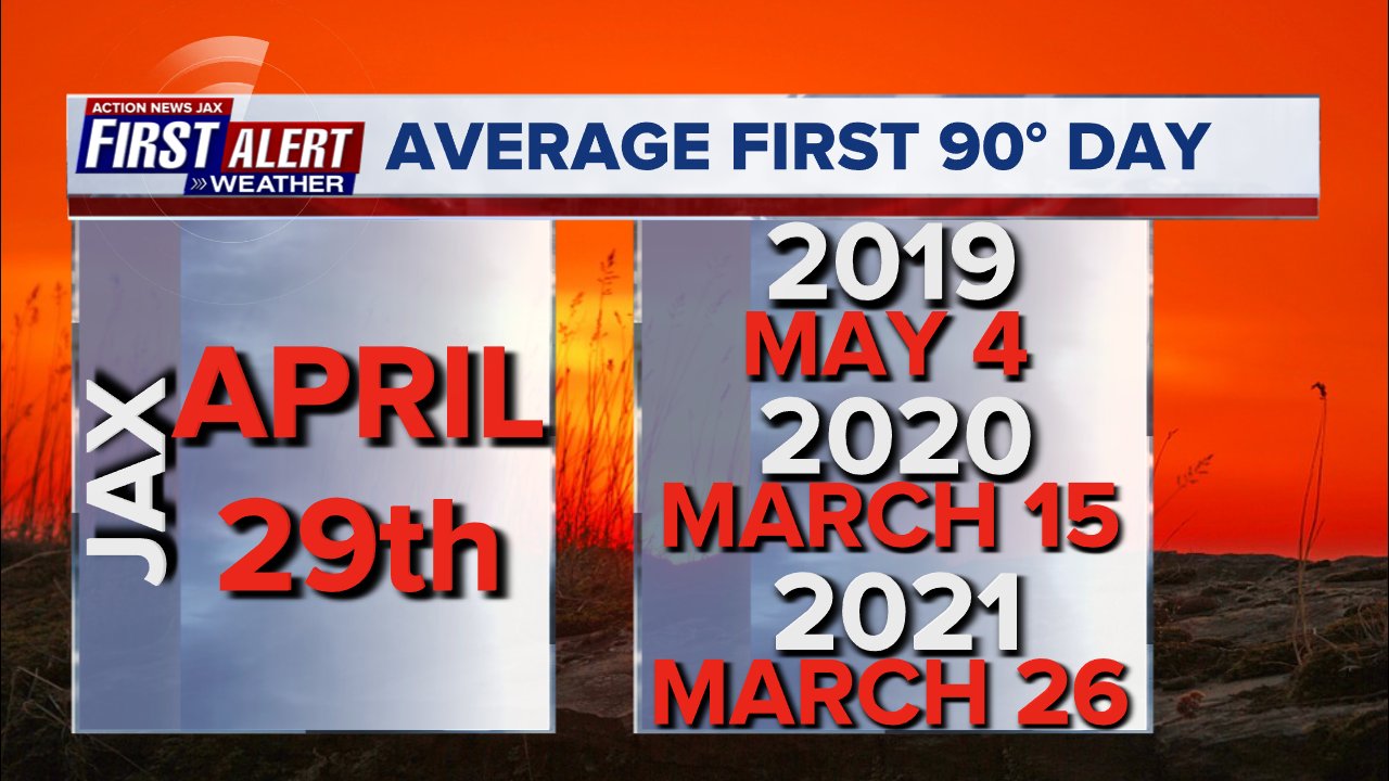 Jacksonville, FL — It’s getting to be that time of year - 90 degree temps.! Jacksonville averages 82 90-degree days per year with the majority from late May through early September. The average first 90 degree day at JIA is near the end of April - April 29th to be precise.