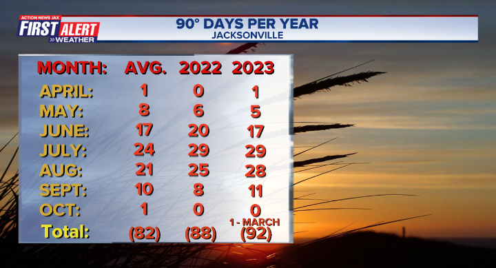 Oct. 31st/Halloween is the latest in the season that Jacksonville has officially hit 90 degrees F. So for the year of 2023 we end up with 92 90-degree days which is 10 above the avg. of 82 90-degree days but nowhere near the most 90-degree days in a year which is 114(!) days in 2011.