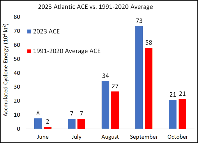 Dr. Phil Klotzbach, Colorado State U shows the ACE (accumulated cyclone energy) [“overall activity” & refers to the collective strength and duration of Atlantic tropical storms and hurricanes occurring during a given season] has been ‘above average’ for the season so far. One hurricane hit on the Lower 48 - “Idalia” - in late Aug.... 7 hurricanes in total which is right at the seasonal avg.