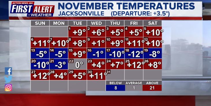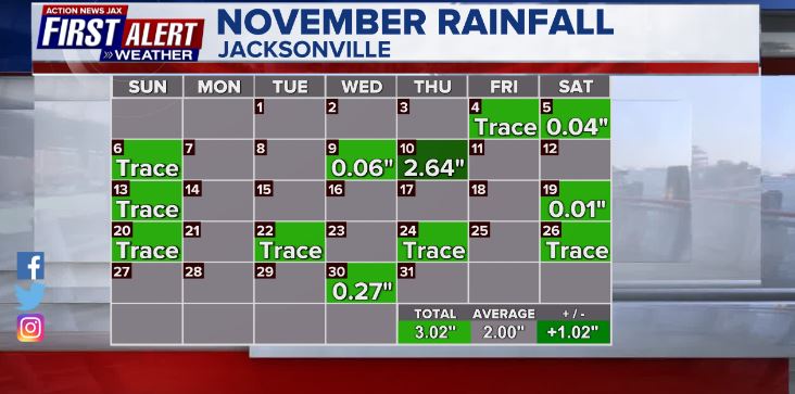 Jacksonville, FL — November ended up mild & somewhat wet. “Somewhat” because almost all of the Nov. rain fell on a single day - Nov. 10th when Nicole moved across Florida. There were only 4 other days with measurable rain with the month ending up just a bit more than 1″ above average.