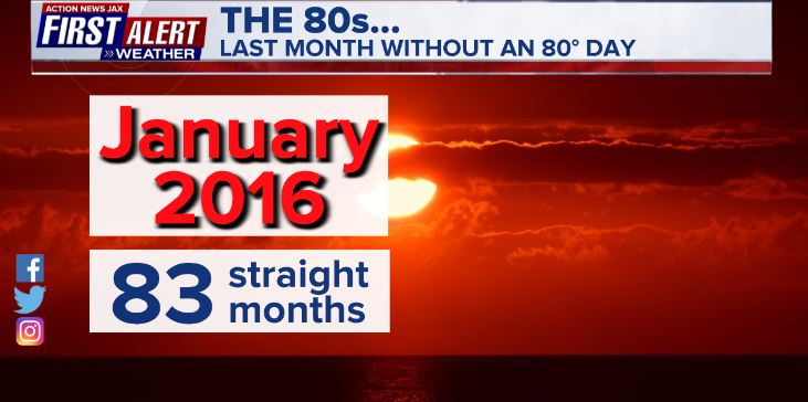 Our - Jacksonville - streak of at least one 80 degree day each month continues reaching nearly 7 years! Temps. were 80+ Tue. & Wed., Dec. 6-7 including a record-tying high of 83 degrees on the 7th (Dec. 7th, 2013).