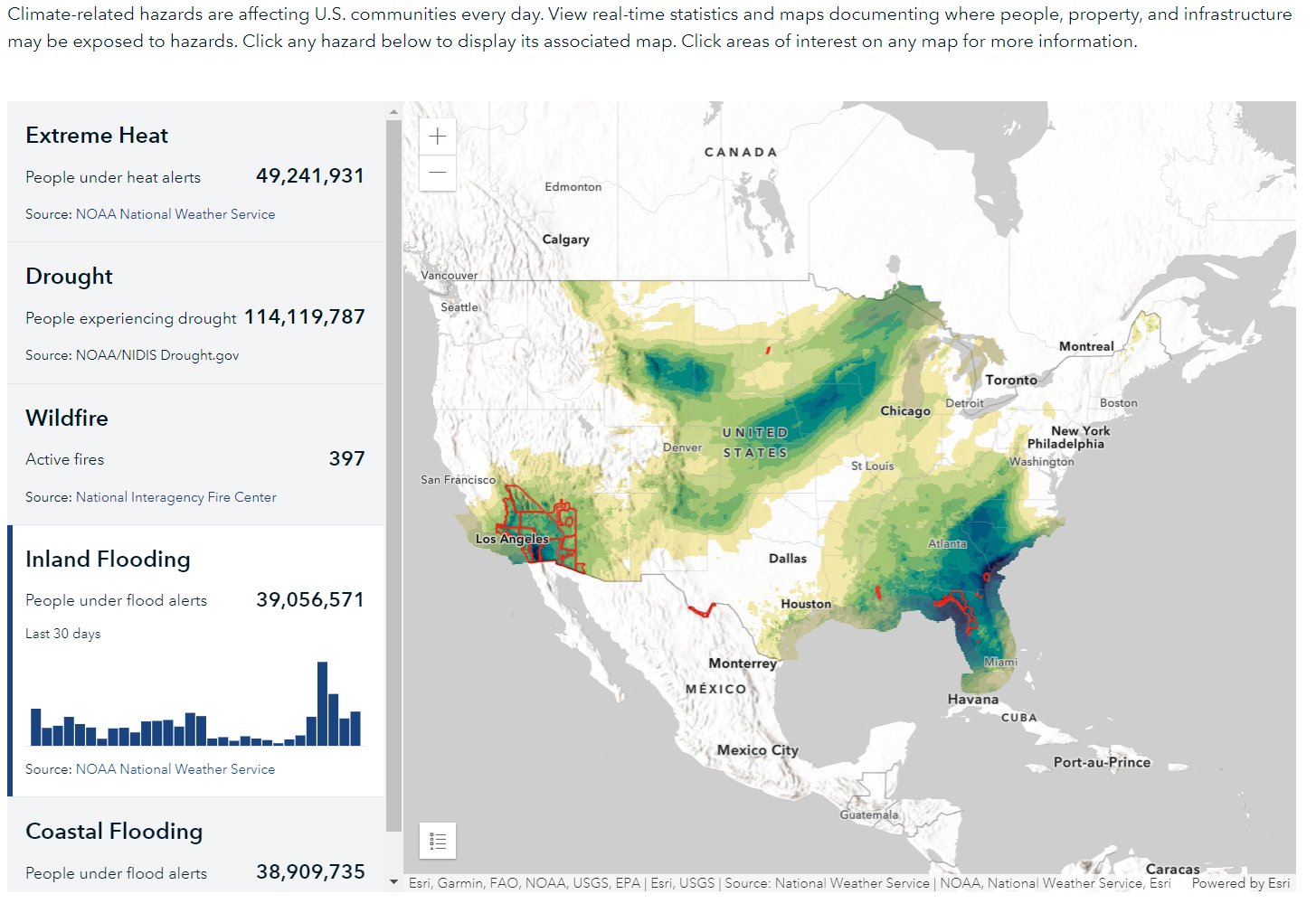 - Real-time monitoring dashboard: To help track the climate-related hazards that are affecting communities each day, a new dashboard brings together maps showing areas currently under extreme heat advisories, drought conditions, and inland and coastal flooding warnings, as well as the locations of active wildfires and areas of poor air quality they produce.
