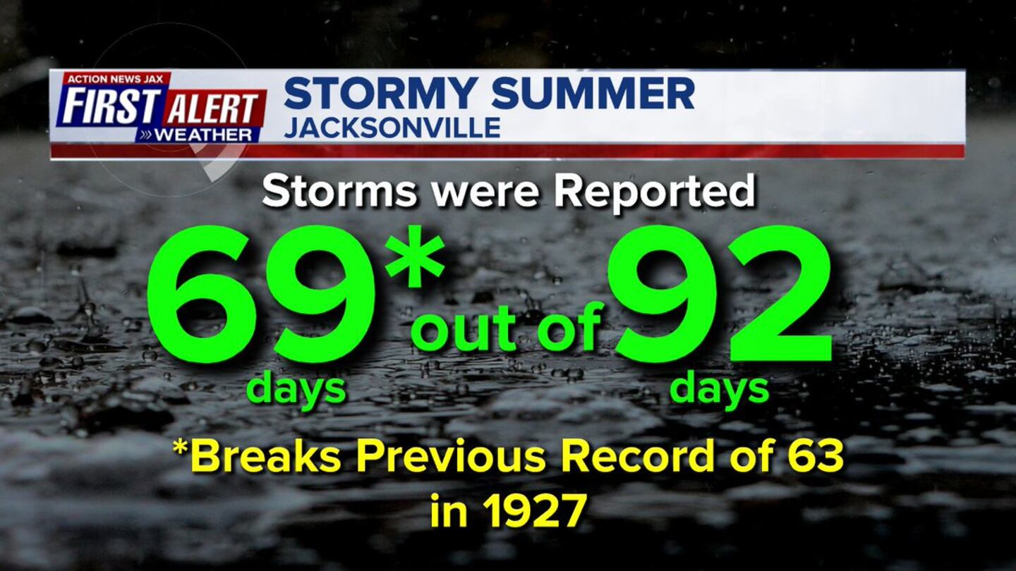 We're coming off a very stormy summer (June/July/Aug.), & the stats - provided by the Jax N.W.S. - prove it. 69 out of 92 - or about 75% - of the summer days had t'storms officially at JIA. Some places had even more days with thunder/lightning. The avg. is 47 days. Rainfall between 25 & 30" "only" ranked the summer as the 16th wettest on record... & not as wet as last summer(!).