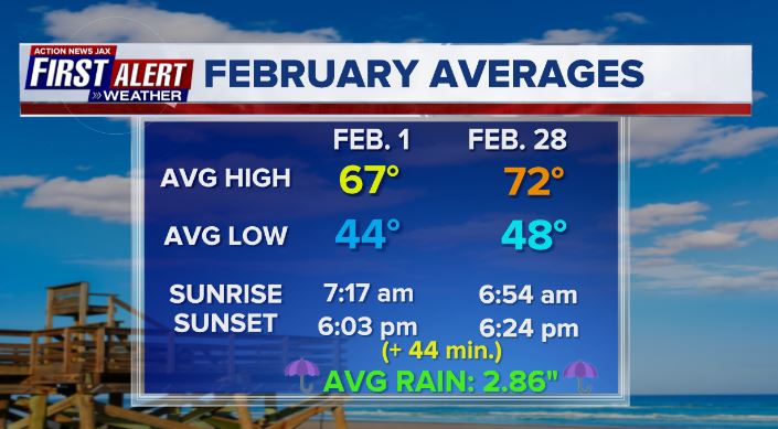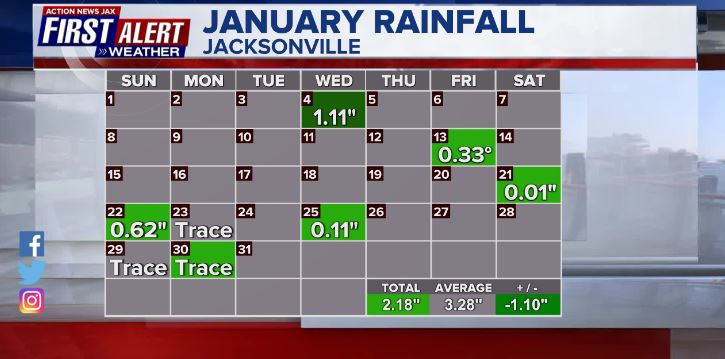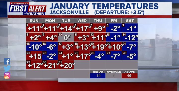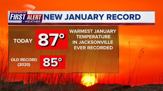 Jacksonville, FL — January had a wide range of temps. including four freezes to go along with 4 record highs. The warmest temps. were near the end of the month & included an all-time (going back to 1871) January record on the 30th of 87 degrees. We have never had a 90-degree day in Jacksonville before March 10th (1974) & the avg. first 90 day is May 5th.