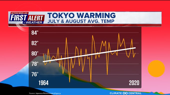 The Olympics are set to begin & will roll into Aug. This is a hot/humid time of year with the avg. high 86-88 degrees F (30-31 degrees C), the avg. low 74-76 degrees F (23-24 degrees C). The image below from Climate Central shows there has been a slow increase in the avg. temp. in Tokyo since 1964 from a little over 78 degrees F to near 81 degrees F. This time of year can be pretty wet too with even the threat of tropical systems.