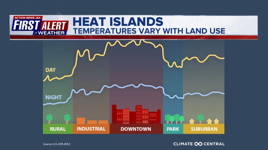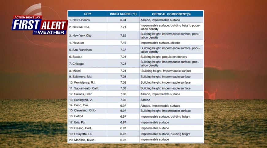 The inner city urban core generally experiences hotter conditions overall - the “heat island” effect that goes with lots of buildings & concrete. Temps. are generally warmer at night & can be noticeably hotter during the day. Duval Co. is blessed to have many parks which does help. The estimate is about a 6.3 degree “bump” for the immediate downtown area of Jacksonville on a summer day of full sunshine. This does not put Jacksonville into the top 20 nationally (3rd image below).