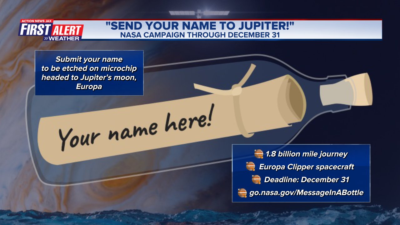 To make this experience even more personal, NASA is currently running a “Send Your Name to Jupiter” campaign. Anyone can submit their name - at no cost - to be etched on a microchip that will travel 1.8 billion miles on NASA’s Europa Clipper spacecraft when it launches next year to explore one of Jupiter’s moons, Europa. The deadline is Dec. 31. People can send their name by going to go.nasa.gov/MessageInABottle. It’s the ultimate holiday destination.