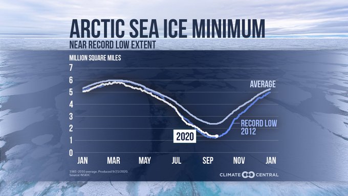 · The 2020 minimum is about 969,000 square miles below the 1981-2010 average minimum extent, which is equivalent in size to roughly the states of Alaska, Texas, and Montana combined