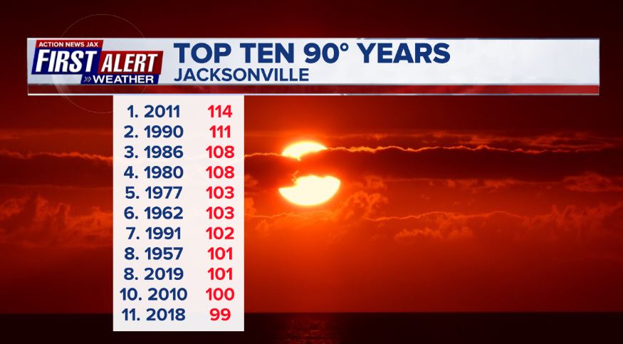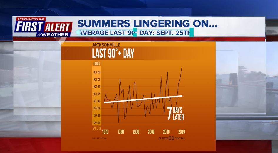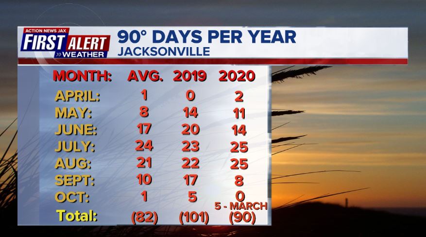 The winter ahead comes after a hot summer for much of the Lower 48 *but not so much* for Jacksonville & nearby areas (only slightly above avg. temps with a lower than avg. July). Having said that, our warming earth has led to a later date of the avg. last 90 temp. of the year for Jacksonville - between Sept. 26th & Oct. 5th vs. about a week earlier in the 1970s, ’80s & ’90s. So far - as of Oct. 15th - there have been no 90 degree days in Oct. with the total this year at 90 which is 8 days above avg. but far from the record of 110+ days (which has occurred twice [2011 & 1990] since 1871). Were it not for a hot start to spring with five 90-degree days in March, 2020 would be very near the annual avg. of 82 ninety- degree days. The latest 90 degree day on record, by the way - Oct. 31st, last year in 2019.