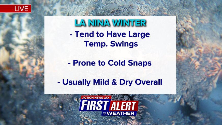 (2) A weak La Nina for Jacksonville & nearby areas has been - in the past - subject to big temp. swings favoring short but intense cold snaps. The current La Nina is forecast to be at least weak but possibly reaching moderate strength.