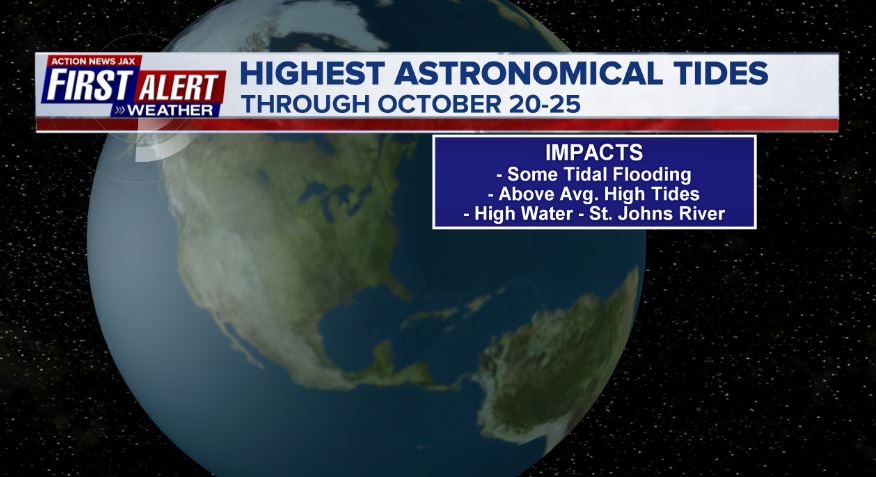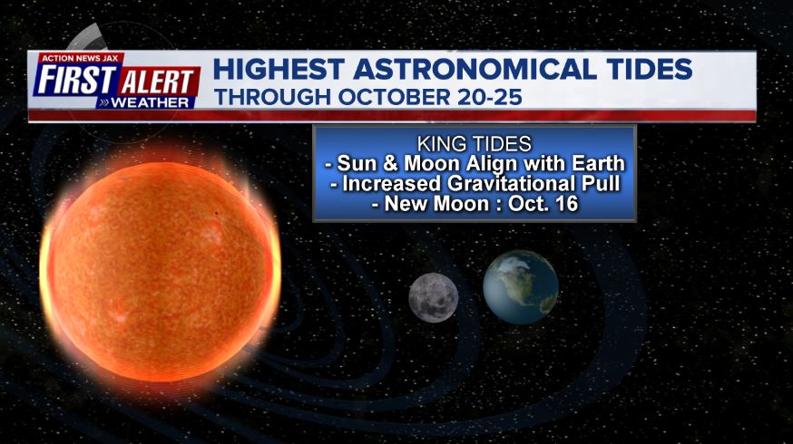 'Tis the season for king tides - an annual astronomical/marine phenomenon that occurs every mid to late autumn in Oct. & Nov. often resulting in some of the highest tides of the year. Throw in some meteorological input such as onshore (out of the east) winds &/or heavy rain & the tides can be especially high. King tides are the result of the new moon phase in conjunction with the sun & earth causing an increased gravitational pull. The result is at least some minor/nuisance flooding along the coast, intracoastal, St. Johns River & its tributaries along with beach erosion. The new moon in Nov. is on the 15th & will be the next round of king tides.
