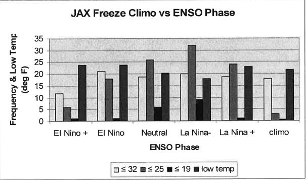 Jacksonville N.W.S. ENSO phase & freeze climatology. A weak La Nina has coincided with some of the most intense freezes on record (19 degrees F or lower) for Jacksonville. A strong La Nina - not so much.