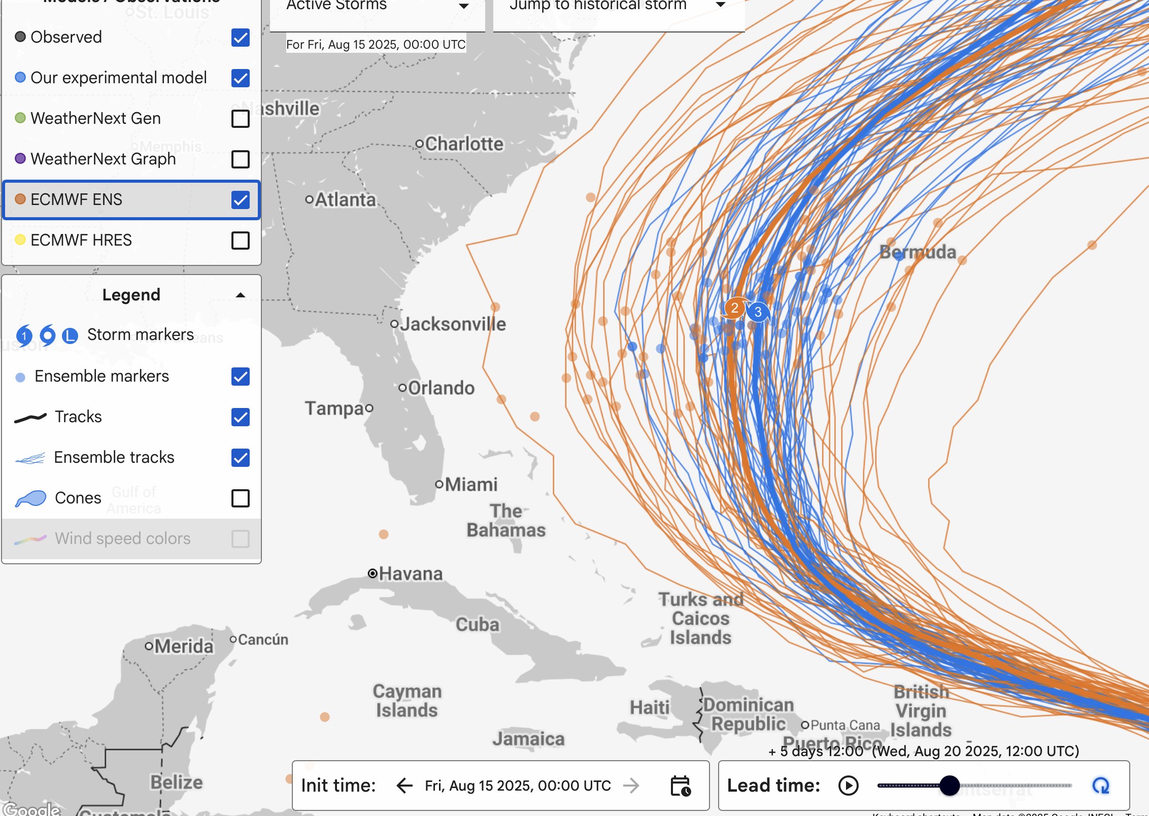 The map below valid for Wed., Aug. 20th shows the forecast from the new Google Weather Lab AI model along with the European HiRes & each model’s ensemble (remains solidly east):
