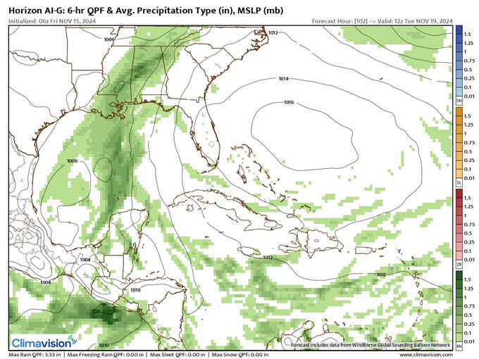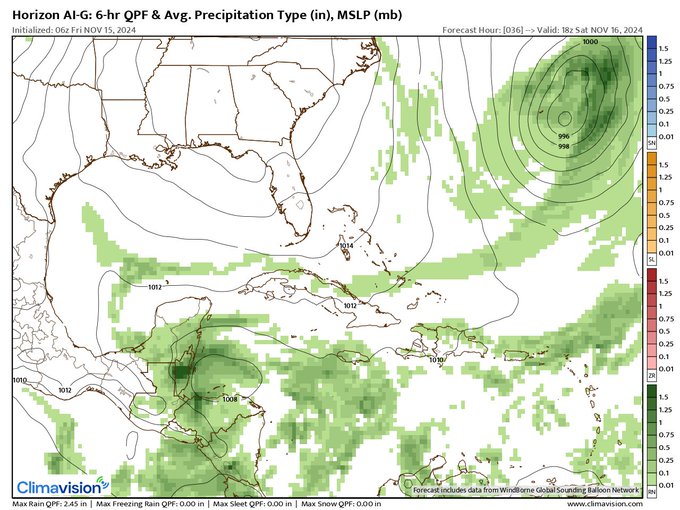 A strong upper level trough of low pressure diving into the Central U.S. next week will help pull the upper reflection of Sara northward into the Gulf then northeast into the Southeast U.S. Climavision ‘HorizonAI’ global model - 4th image below - has Sara moving toward Belize Sat. The 5th forecast map is for early Tue., Nov. 19th & shows weak low pressure over the Central Gulf.