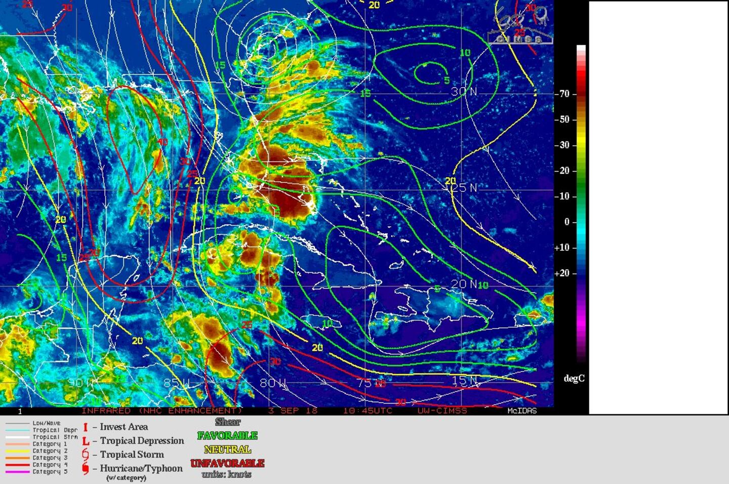 Mid & upper level wind shear (enemy of tropical cyclones) analysis (CIMMS). The red lines indicate strong shear......